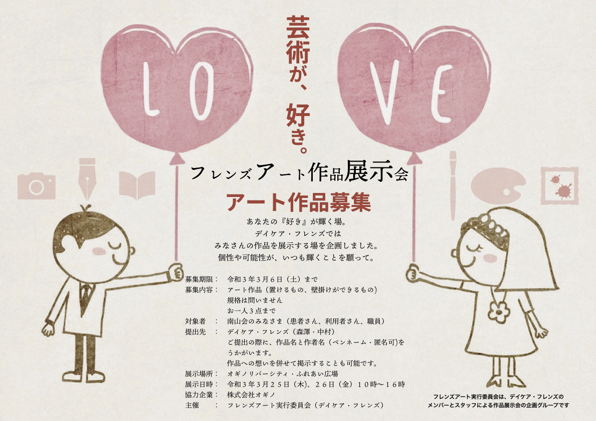 精神科デイケア・フレンズは、南山会の利用者さん、患者さん、職員によるアート作品を展示する「フレンズアート作品展示会」を開催します。