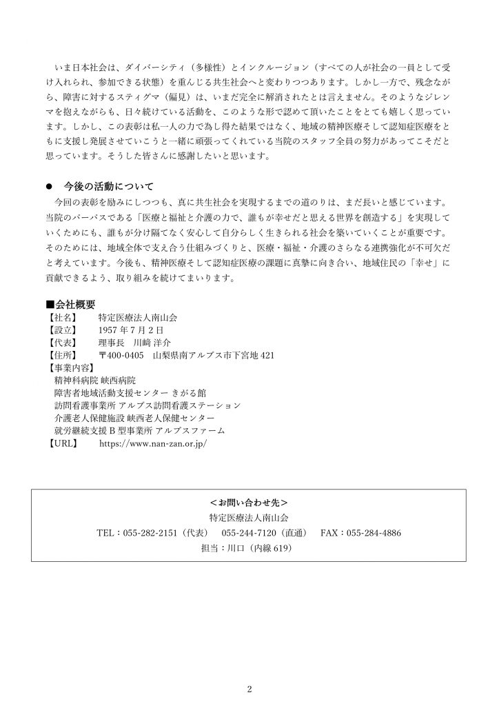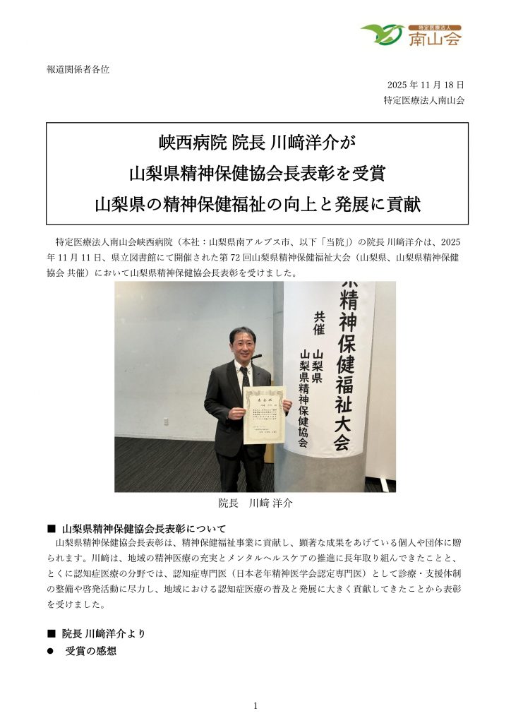 「誰もが安心して自分らしく生きられる社会」を目指し、地域の精神医療と認知症医療に取り組んできた峡西病院院長・川﨑洋介が、その功績を称えられ、山梨県精神保健協会長表彰を受賞しました。詳しい内容は以下よりどうぞご覧ください。