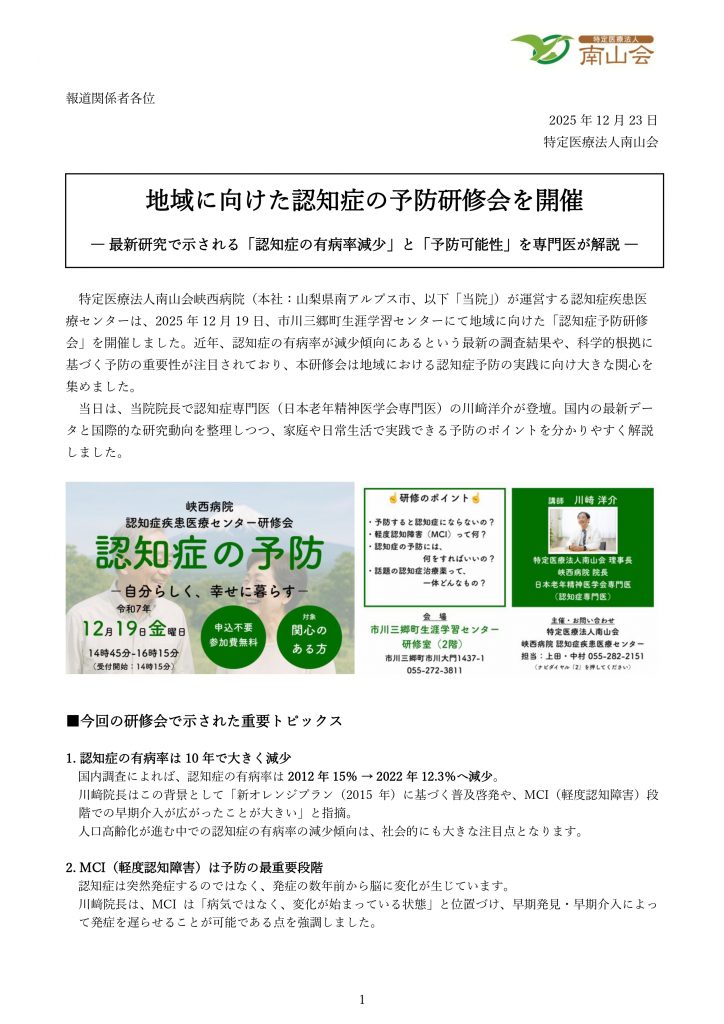 特定医療法人南山会 峡西病院 認知症疾患医療センターは、2025年12月19日に市川三郷町生涯学習センターにて、地域住民を対象とした「認知症予防研修会」を開催しました。近年の研究で、日本国内の認知症の有病率が減少傾向にあることや、MCI(軽度認知障害)段階での早期介入の重要性が注目されています。本研修会では、最新データを踏まえた予防のポイントや、日常生活で実践できる取り組みについて専門医が分かりやすく解説しました。