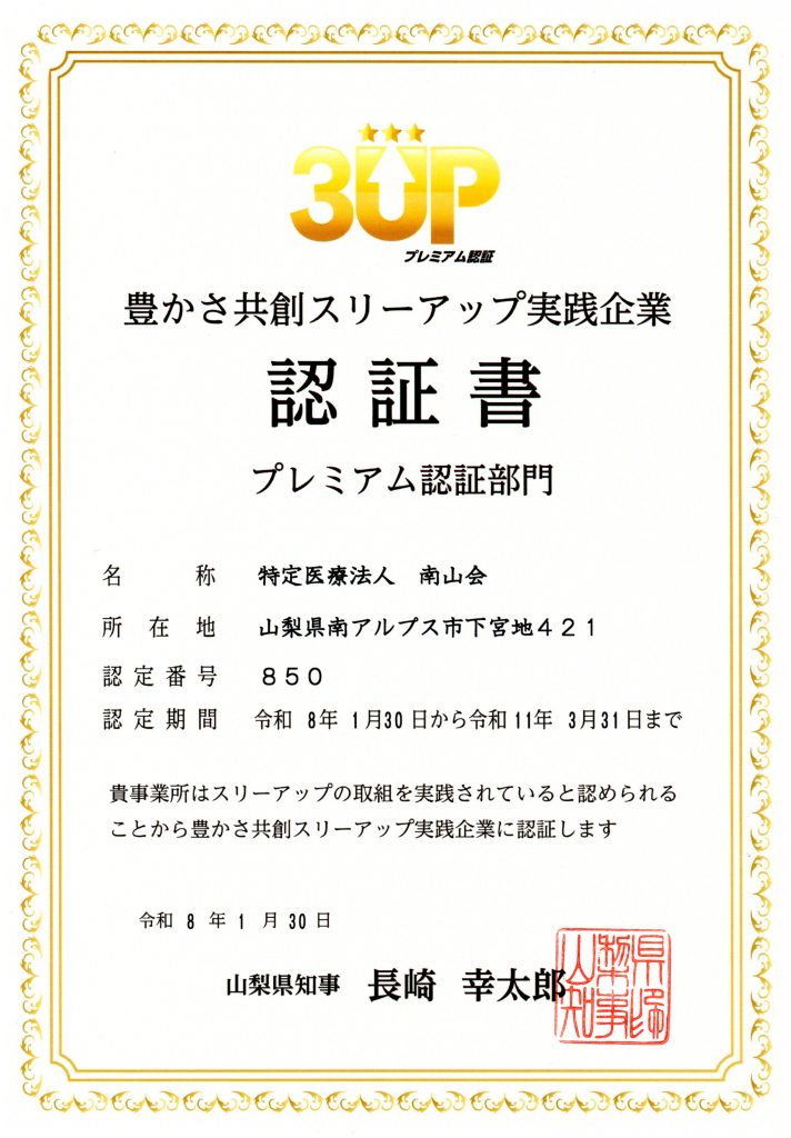 特定医療法人南山会は、山梨県が創設した「豊かさ共創スリーアップ実践企業認証制度」において、このたびスリーアップ実践企業として認証を受けました。